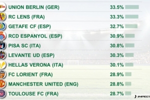 体育资讯11月4日讯 CIES统计了本赛季五大联赛球队攻防转换阶段占据进攻总时间的比例,并列出榜单,柏林联合由守转攻占比33.5%居首,朗斯33.3%、赫塔费32.7%二三位。