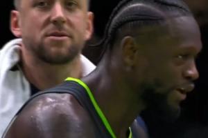 比赛最后时刻,威少压哨篮板达成三双,兰德尔转头对迪文说:“He got a Westbrook triple double(他拿了一个威少式的三双。).”