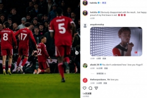 他也在赛后通过社媒晒出自己的滑跪庆祝照,并配文:“显然对结果感到失望,但也为我在利物浦的首次双响感到高兴和自豪。”