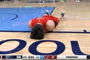 杨瀚森遭遇包夹被埃迪打到面部痛苦倒地 在地上躺了半天没起来