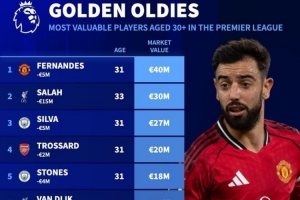 体育资讯12月10日讯 德国转会市场统计了英超30岁以上球员身价排名,曼联队长布鲁诺·费尔南德斯排名第一。
