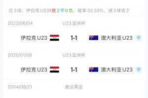 经数据统计,澳大利亚U23与伊拉克U23在U23亚洲杯历史上共有两次交锋,两场比赛两队均以1-1战平,如果这场还是保持这样的结果,最终积分榜形势将是澳大利亚U23积4分,伊拉克U23积3分。