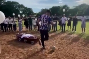 他的棺椁被放置在点球点,一位队友将球踢向棺椁,球弹入网窝。随后众人鼓掌致意,并放飞了白色气球。