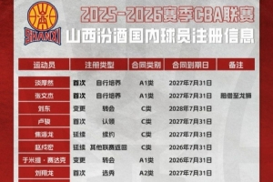 截止8月31日,山西汾酒职业篮球俱乐部新赛季注册工作已全部完成。休赛期,俱乐部管理层多方考察,根据球队现有阵容作出一系列调整和针对性补强。