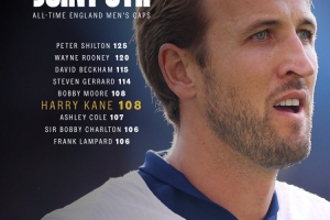 在英格兰2-0安道尔的比赛中,凯恩迎来了在英格兰队的第108次出场,追平博比-摩尔,并列英格兰队史第5。