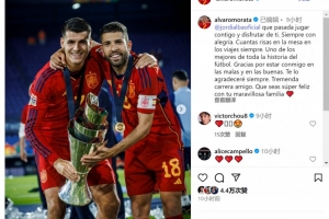 莫拉塔社媒晒出与阿尔巴在西班牙队的合照,并写道:“与你并肩作战、共享欢乐的时光何其珍贵,你总是充满快乐,旅途餐桌上欢声笑语不断。你是足球历史上最杰出的球员之一。”