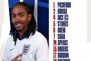 英格兰首发:1-皮克福德、2-孔萨、5-斯通斯、6-格伊、14-斯宾塞、17-戈登、15-罗杰斯、4-赖斯、21-安德森、7-萨卡、19-沃特金斯