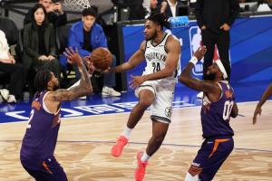 上半场比赛,篮网球员卡梅隆-托马斯在遭遇对手严防的情况下,进攻端依旧稳定表现,多次贡献高难度进球。